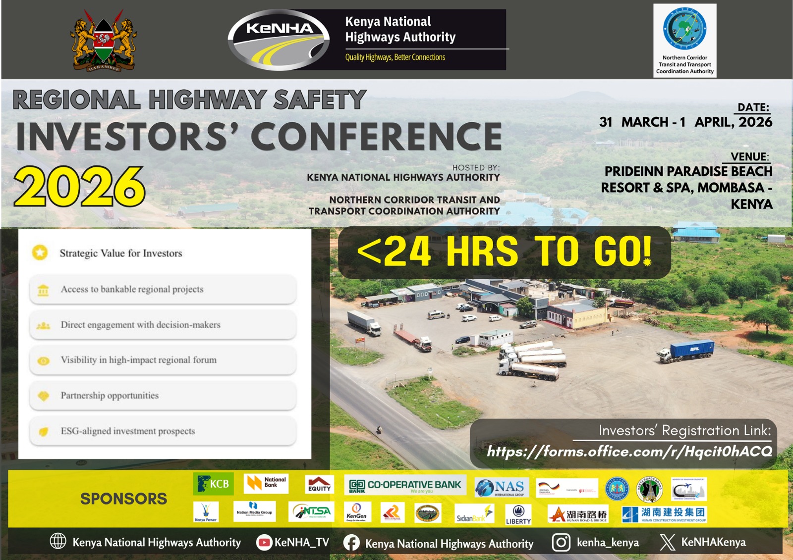 The Kenya National Highways Authority (KeNHA), in partnership with the Northern Corridor Transit and Transport Coordination Authority (NCTTCA), will co-host the Regional Highway Investors Conference from 31st...